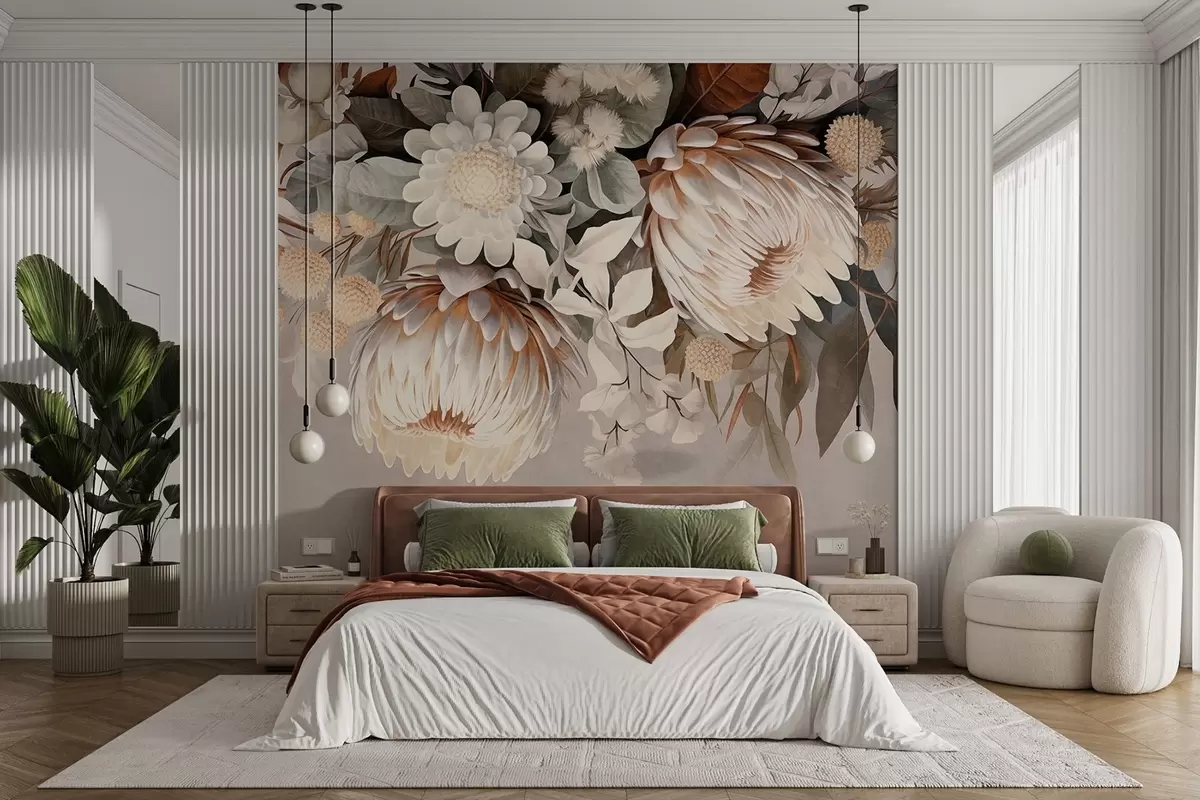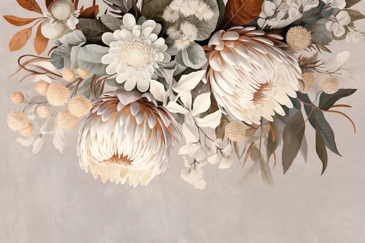 Fotomurales Gran protea texturizada con toques marrones, margaritas blancas y flores amarillas, fondo beige apagado Nr. w09157