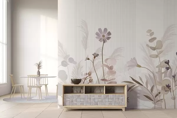 Fotomurales Flores en colores pastel, hojas marrón claro, fondo blanco con líneas verticales, elegante y minimalista Nr. w09161