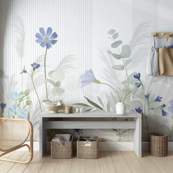 Fotomurales Flores en colores pastel, hojas verde claro, fondo blanco con líneas verticales, elegante y minimalista Nr. w09161v1