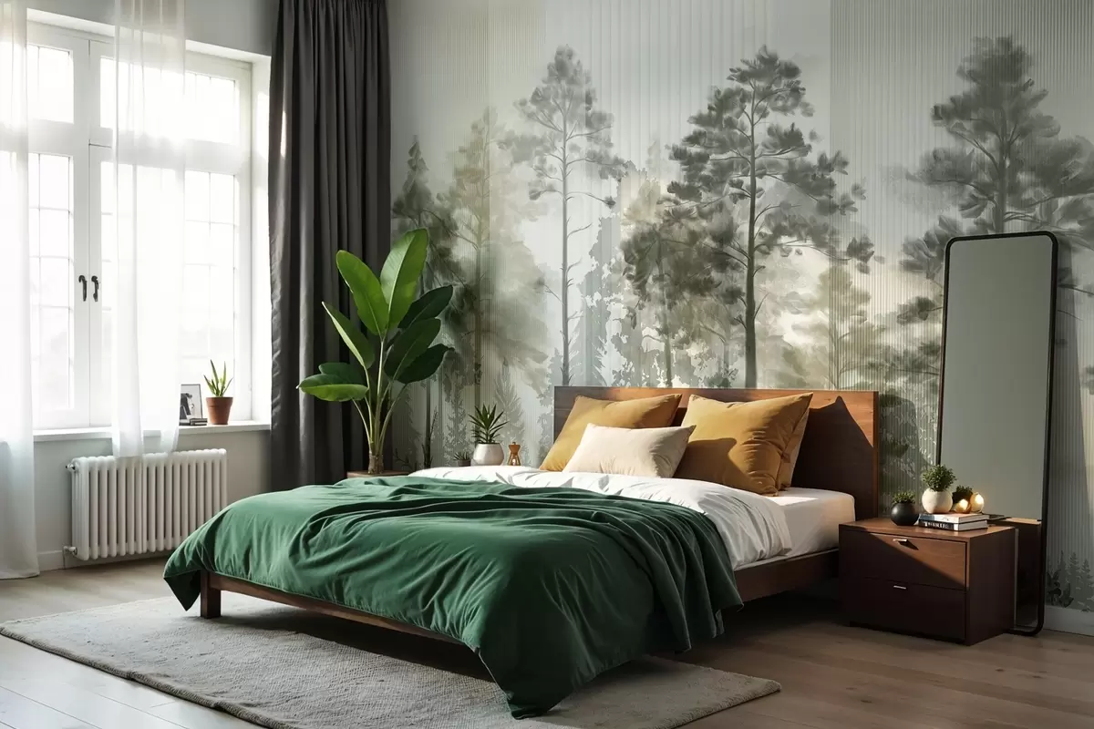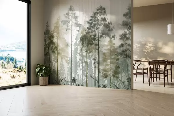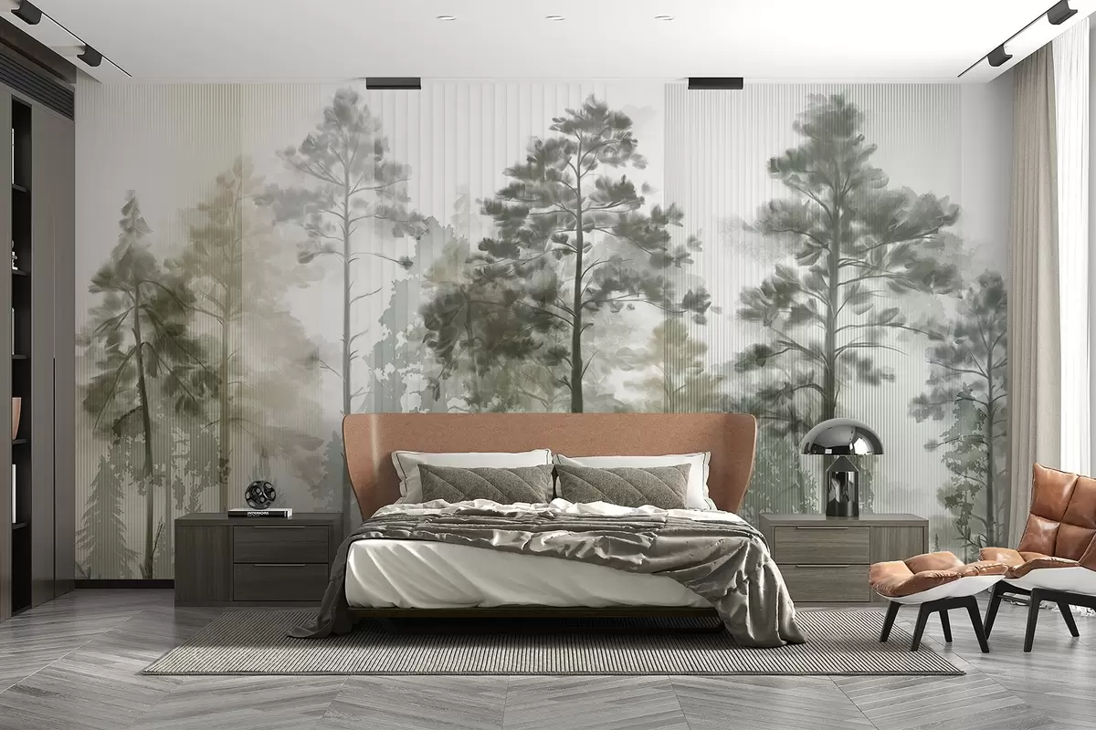 Fotomurales Un denso bosque con altos pinos, exuberante follaje verde, una atmósfera brumosa con texturas de líneas verticales Nr. w09163