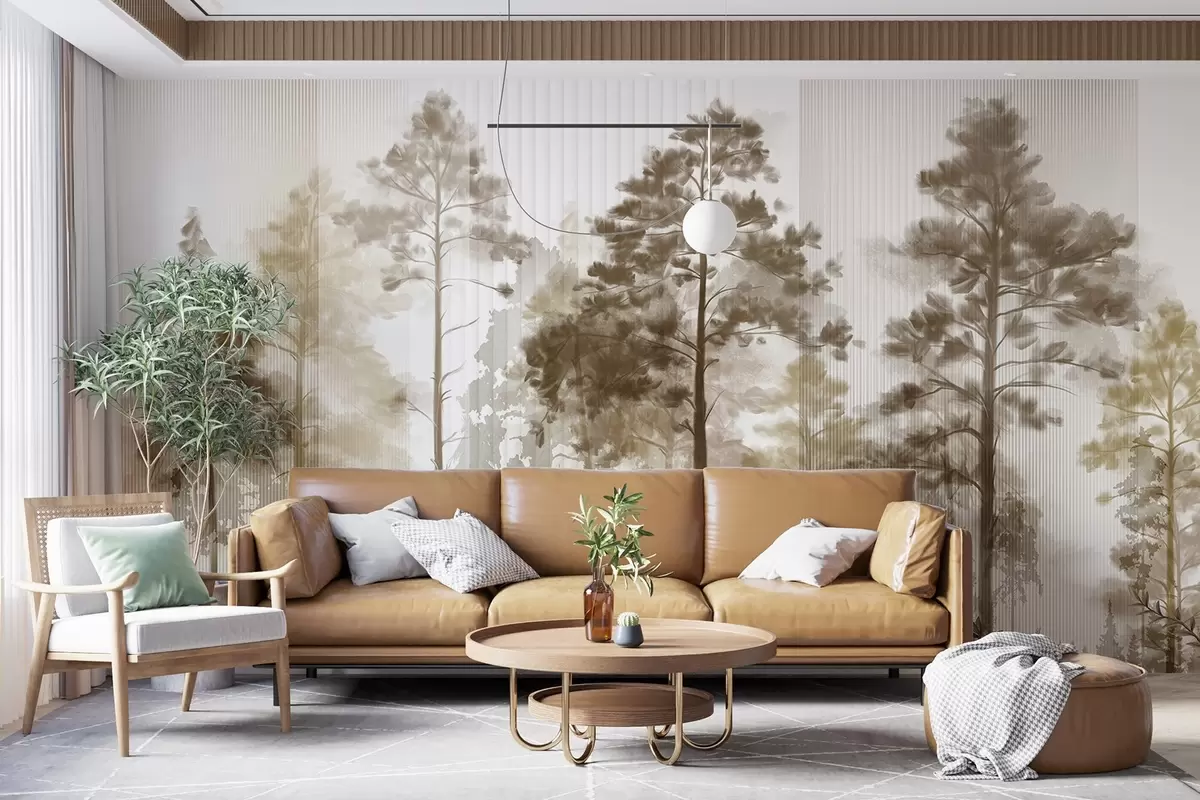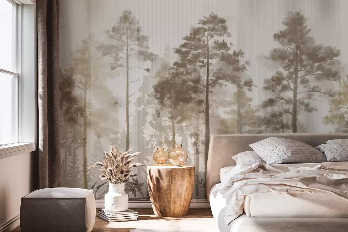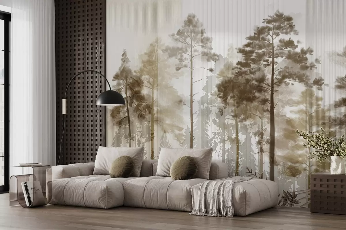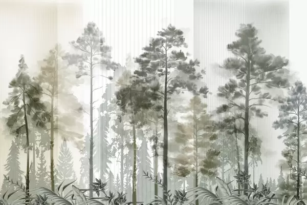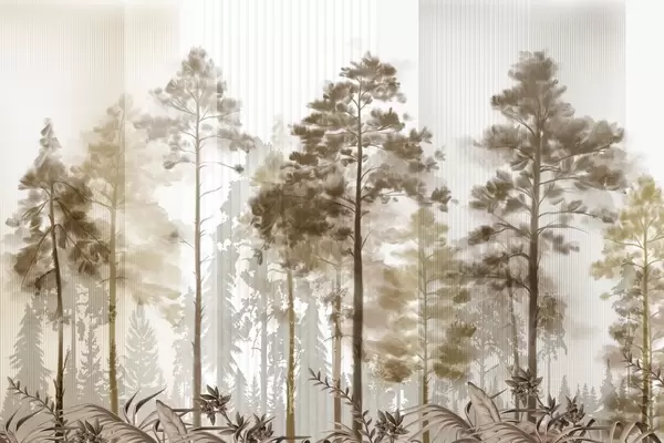 Fotomurales Un denso bosque con altos pinos, exuberante follaje beige, una atmósfera brumosa con texturas de líneas verticales Nr. w09163v1