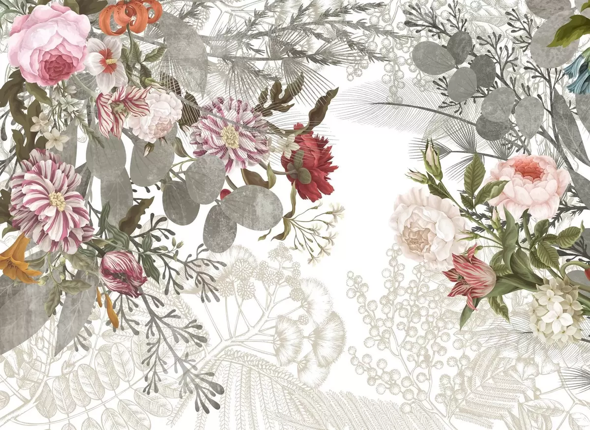 Fotomurales Arreglo floral vintage con rosas, eucalipto y mimosa en tonos verde apagado, rojo y rosa Nr. w09164v1