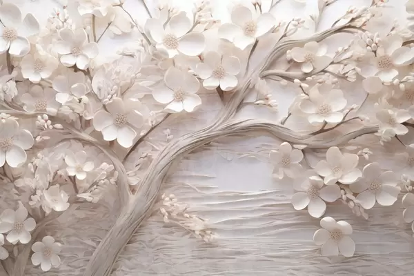 Fotomurales Árbol texturizado con flores blancas y tronco marrón, el fondo es blanco con líneas horizontales iluminación suave Nr. w09166