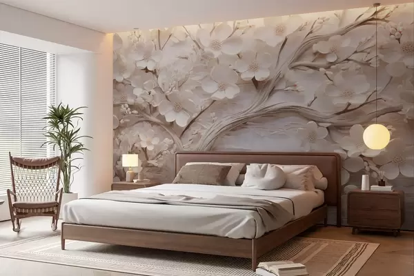 Fotomurales Árbol texturizado con flores blancas y tronco marrón, el fondo es blanco con líneas horizontales iluminación suave Nr. w09166