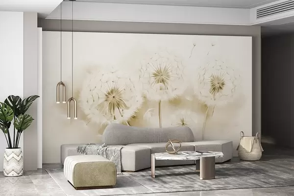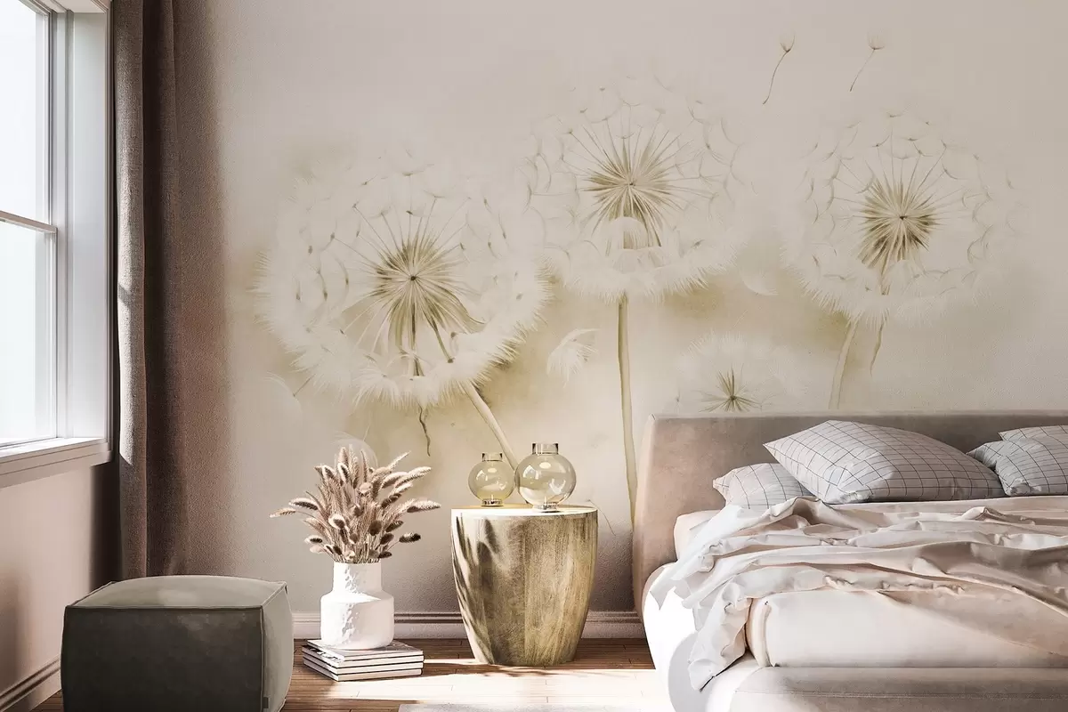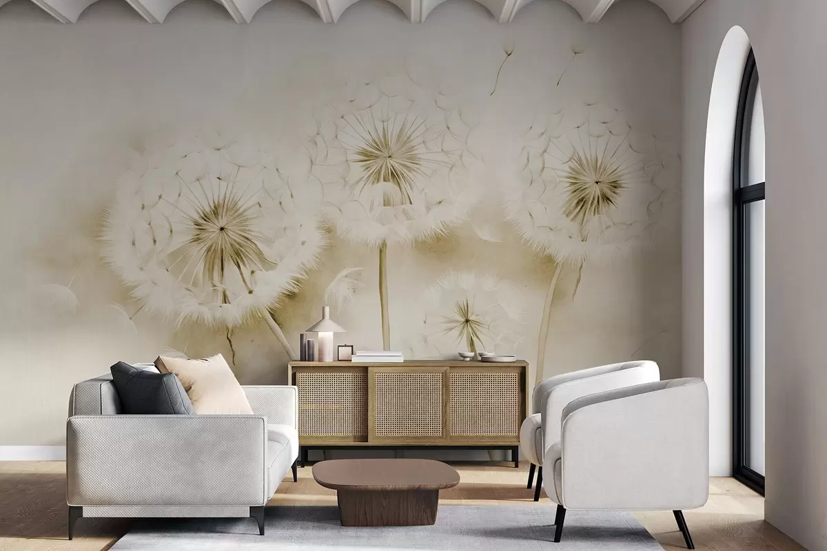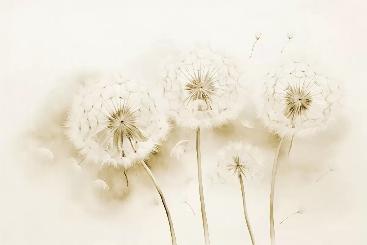 Fotomurales Dientes de león texturizados con semillas flotando en el aire, fondo amarillo y blanco apagado, estilo de dibujo suave y delicado Nr. w09190v1