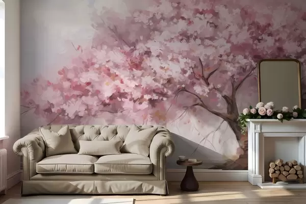 Fotomurales Abstracto árbol en flor rosa en plena floración, junto a un río, pinceladas de textura suave y colores pastel Nr. w09193