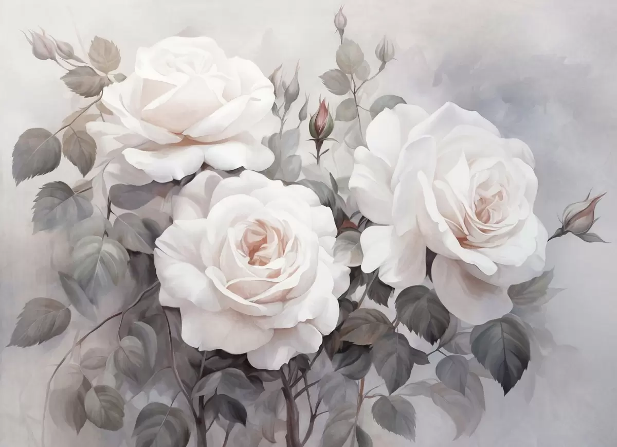 Fotomurales Rosas blancas texturizadas con hojas y tallos, suaves colores pastel apagados, elegante estilo vintage , delicadas pinceladas Nr. w09198
