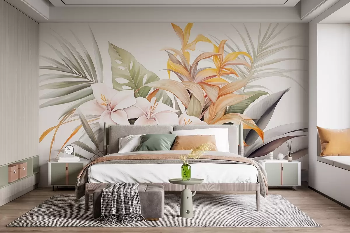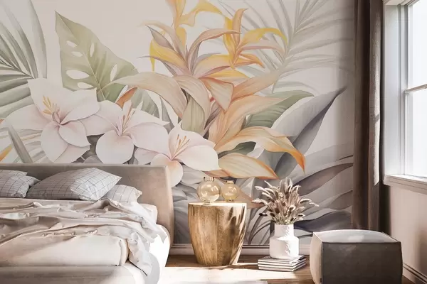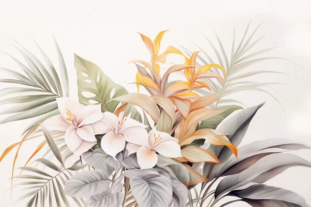 Fotomurales Ilustración botánica de flores tropicales con hojas de palmera y monstera,colores suaves, estilo acuarela Nr. w09201