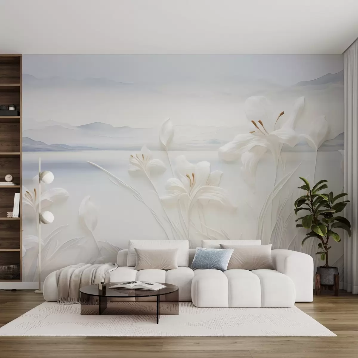 Fotomurales Lirios blancos con largos tallos y hojas, montañas y lago al fondo, composición paisajística minimalista Nr. w09206