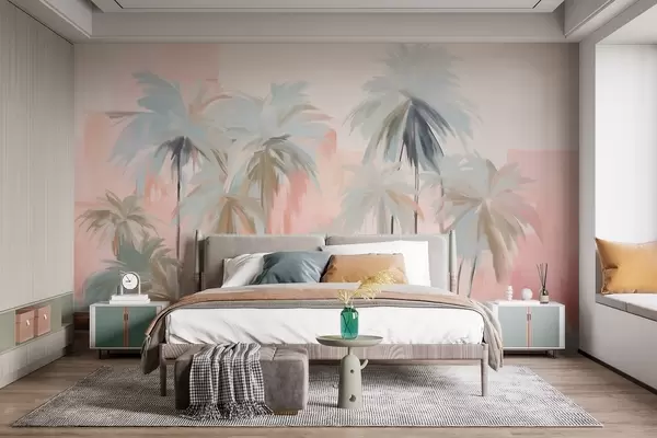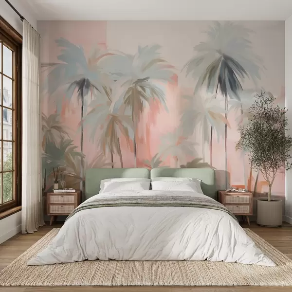 murales de pared Palmeras tropicales abstractas minimalistas en tonos pastel, sobre un fondo de suaves tonos rosa y melocotón w09212