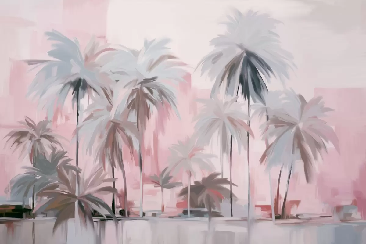 Fotomurales Palmeras tropicales abstractas minimalistas en tonos pastel, sobre un fondo de tonos rosas y grises apagados Nr. w09212v1