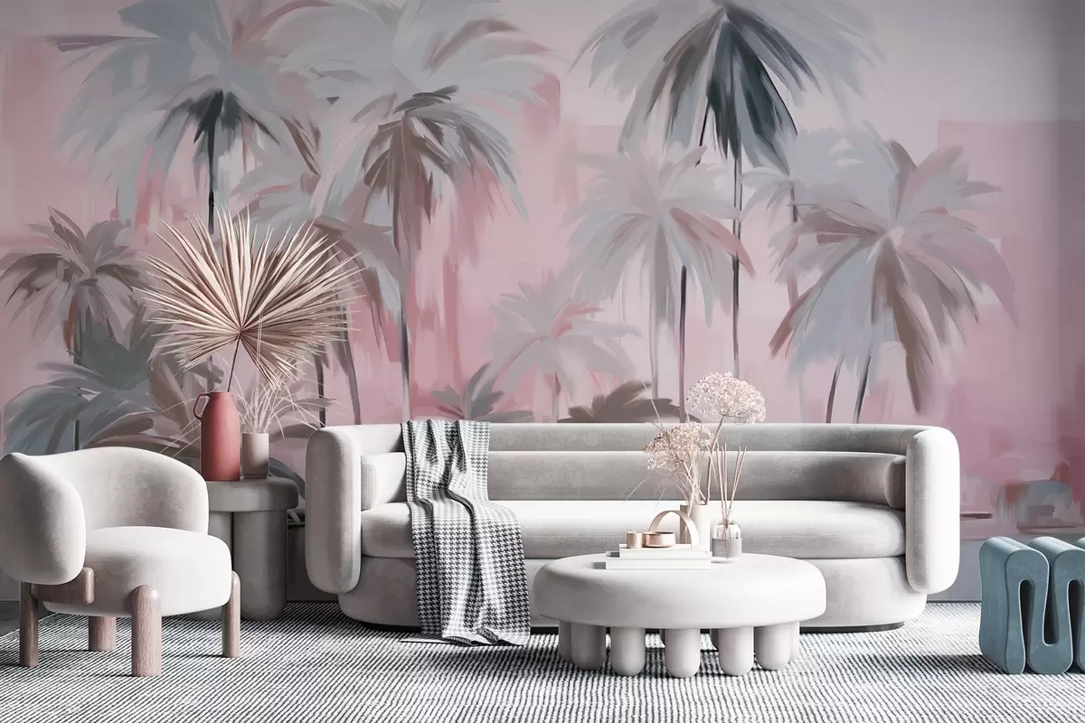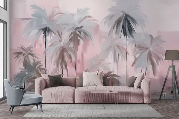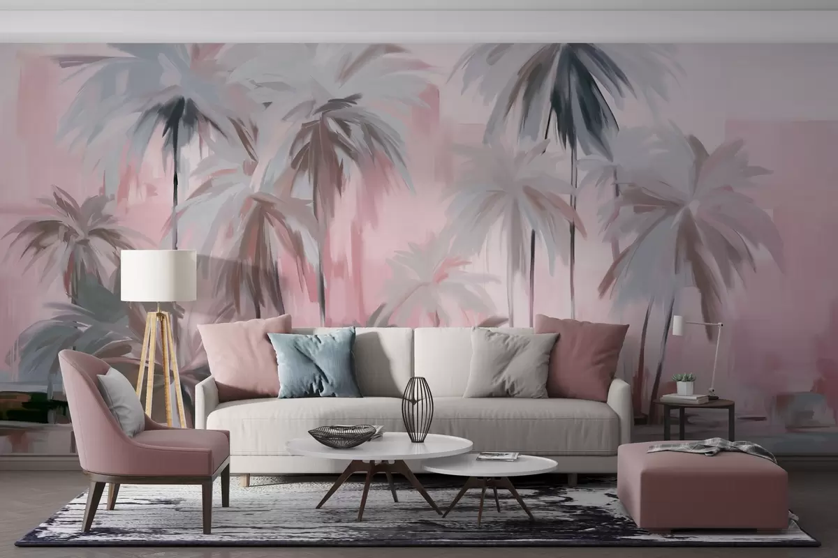 murales de pared Palmeras tropicales abstractas minimalistas en tonos pastel, sobre un fondo de tonos rosas y grises apagados w09212v1