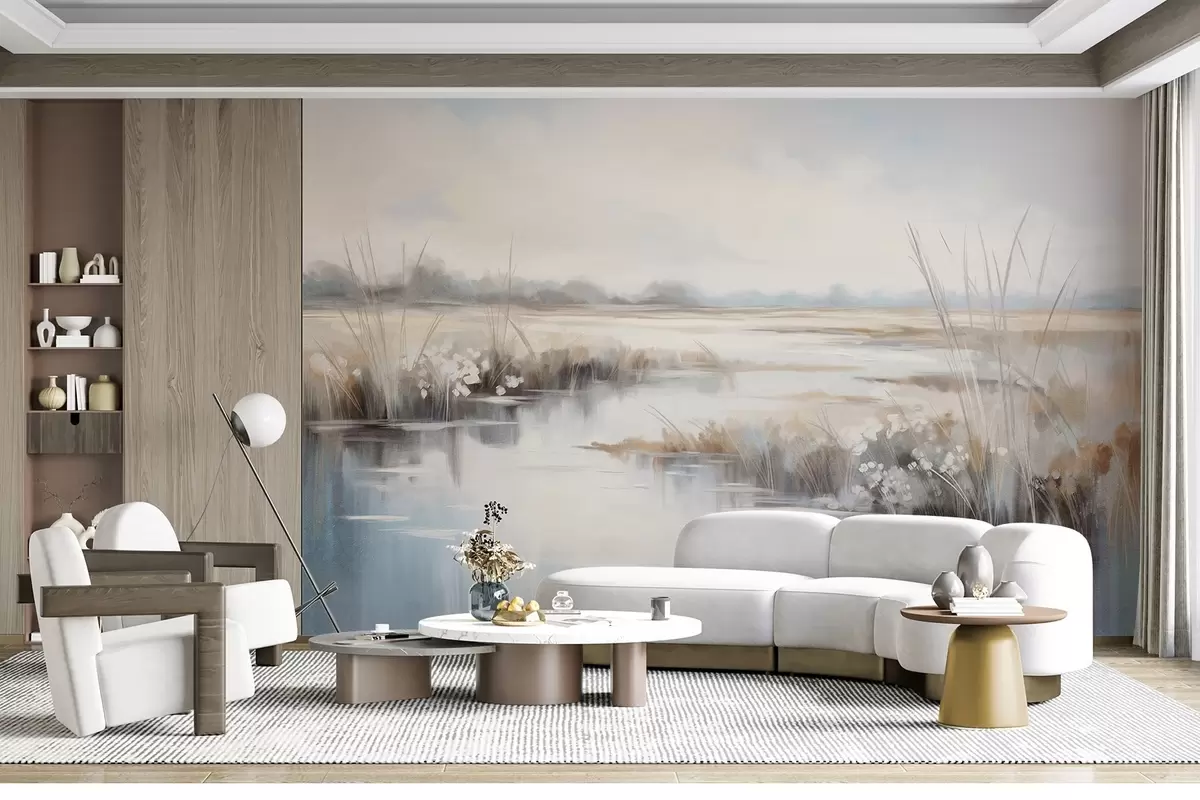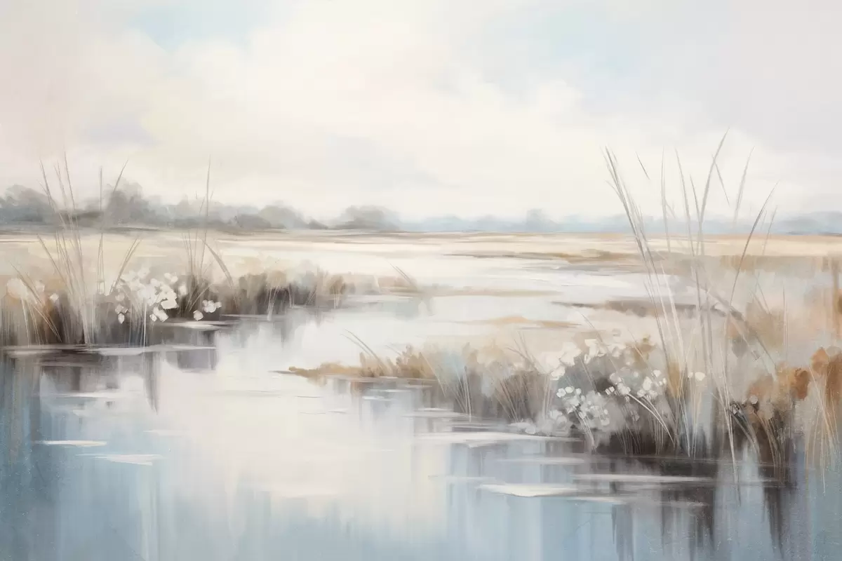 Fotomurales Paisaje tranquilo y texturizado con hierbas altas y aguas tranquilas, suaves colores pastel, árboles lejanos en el horizonte Nr. w09213