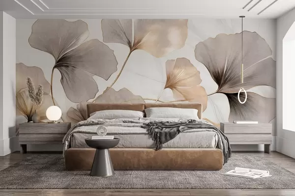 murales de pared Hojas de Ginkgo biloba en tonos beige, amarillo y marrón, delicado efecto de acuarela texturizada, fondo claro w09215