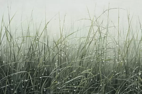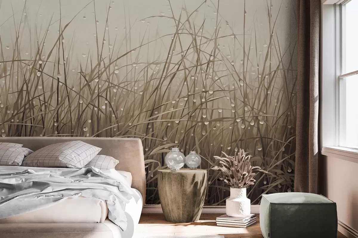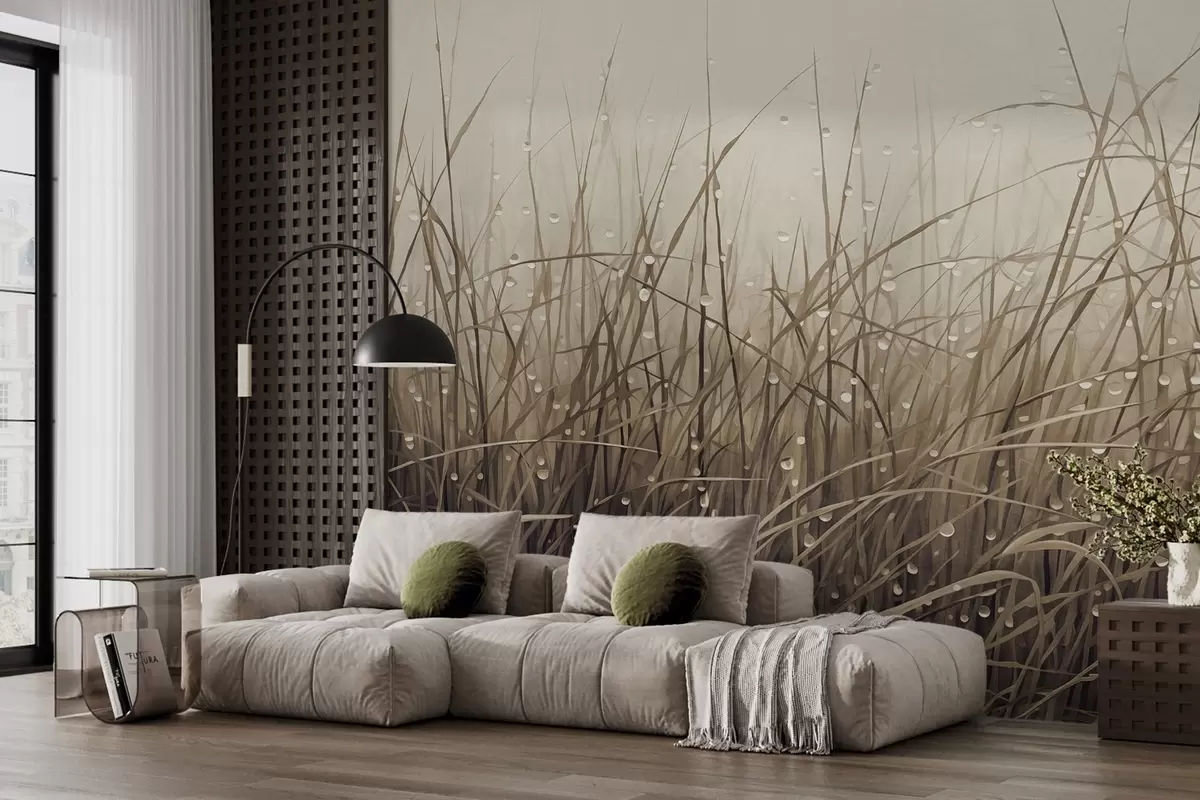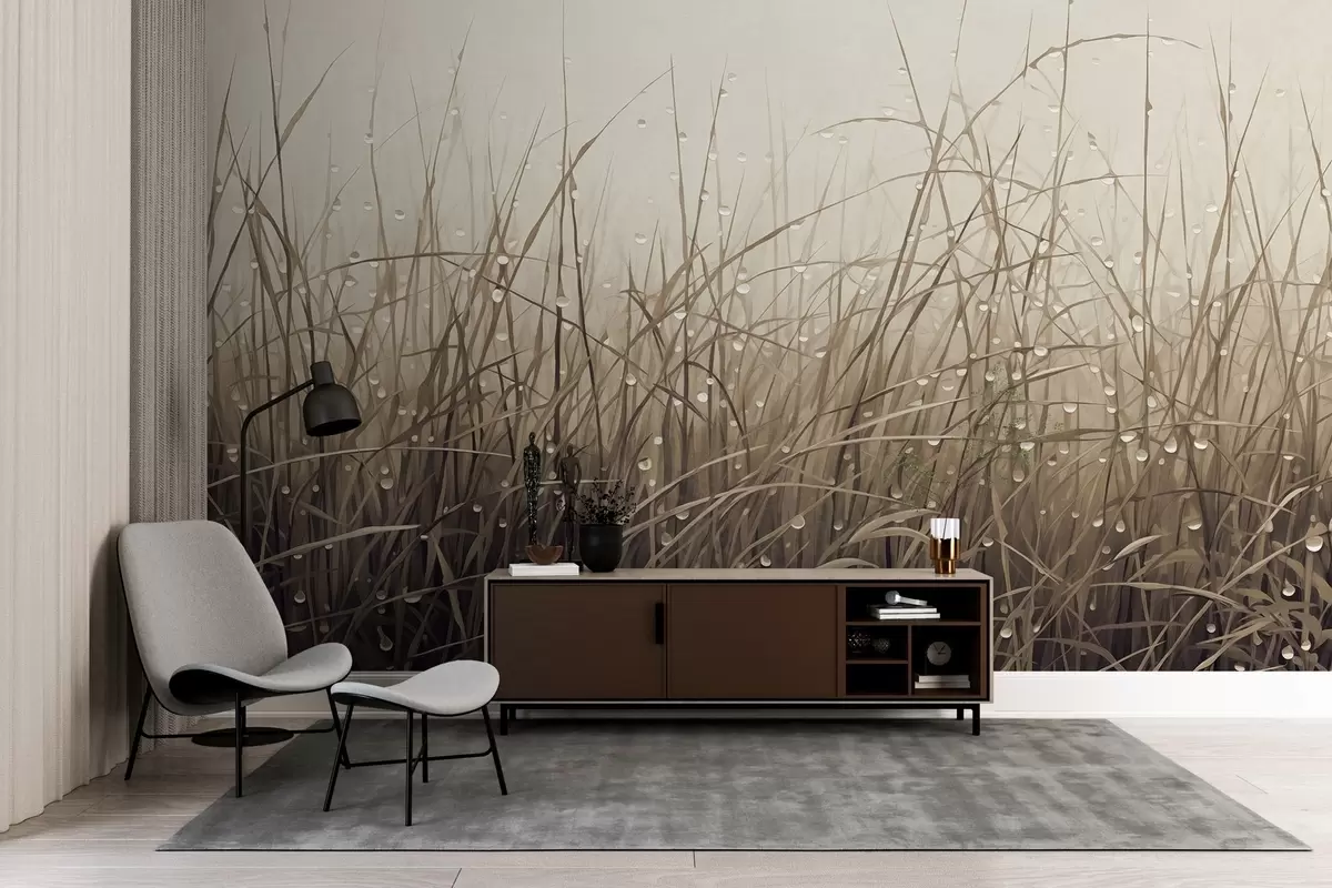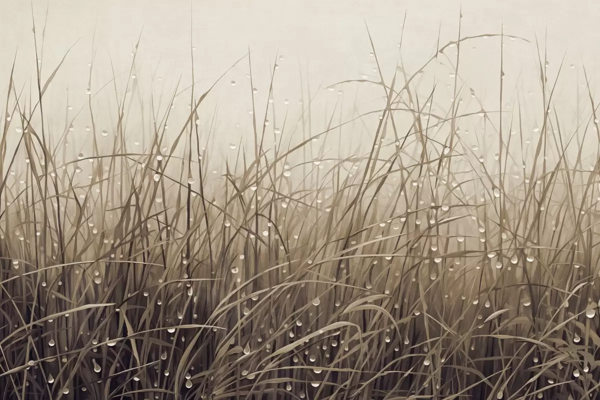 Fotomurales Hierba con gotas de agua, tonos marrones apagados, luz suave, fondo brumoso, estilo abstracto minimalista con textura Nr. w09217v1
