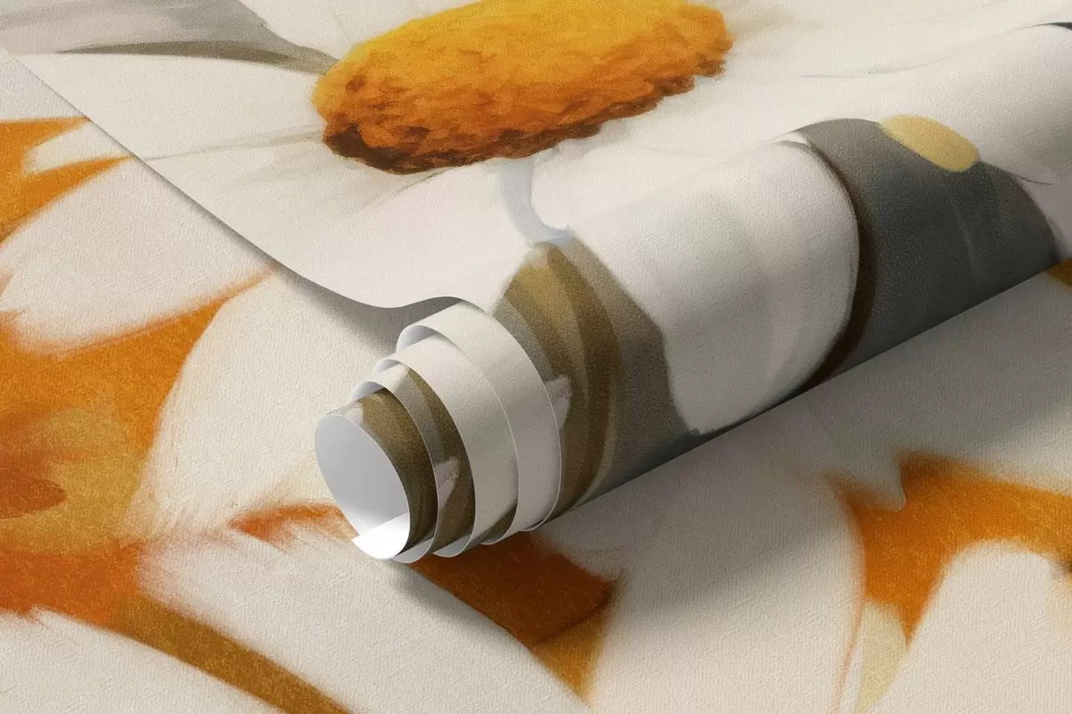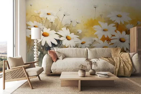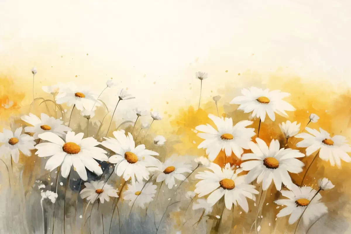 Fotomurales Un campo de margaritas blancas con centros amarillos, sobre un suave fondo amarillo y beige, estilo acuarela Nr. w09218