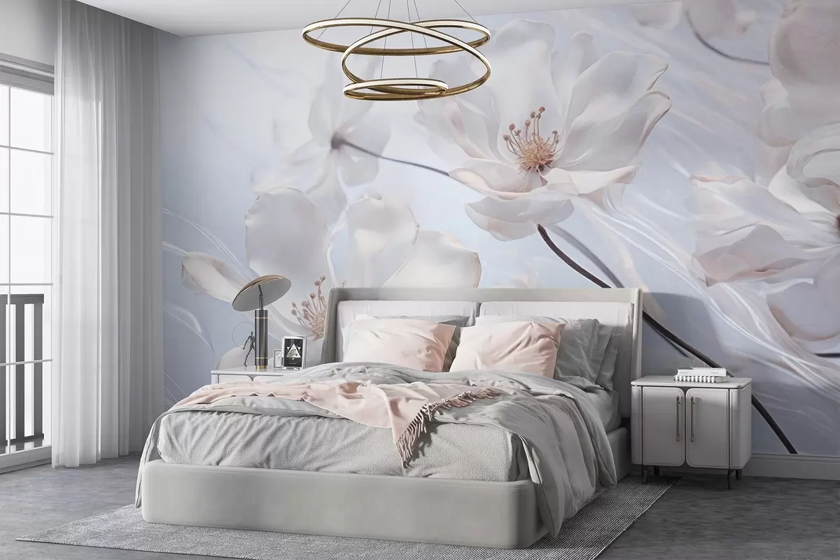 Fotomurales Flores blancas transparentes texturizadas con delicados pétalos, fondo azul claro suave, elegante, romántico, de ensueño Nr. w09233