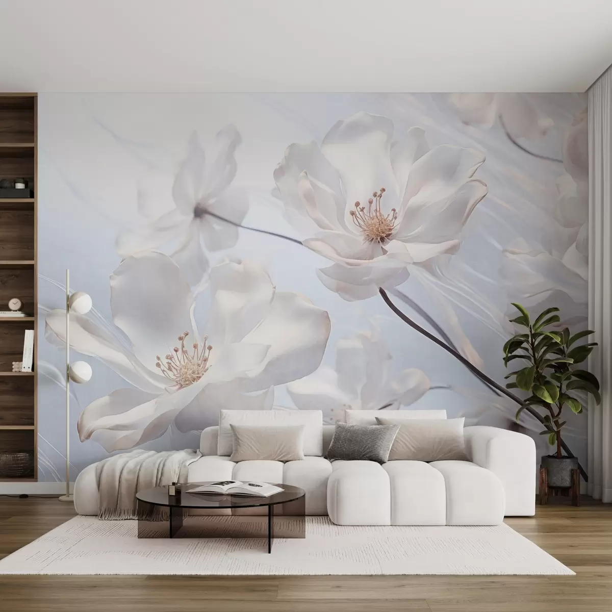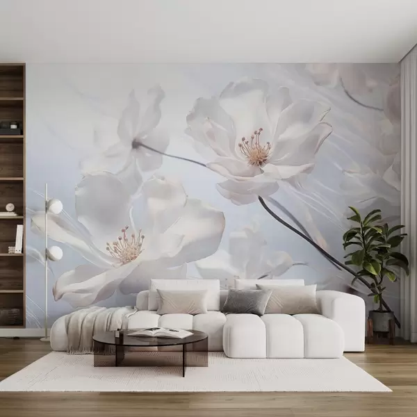 Fotomurales Flores blancas transparentes texturizadas con delicados pétalos, fondo azul claro suave, elegante, romántico, de ensueño Nr. w09233
