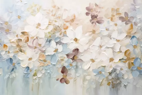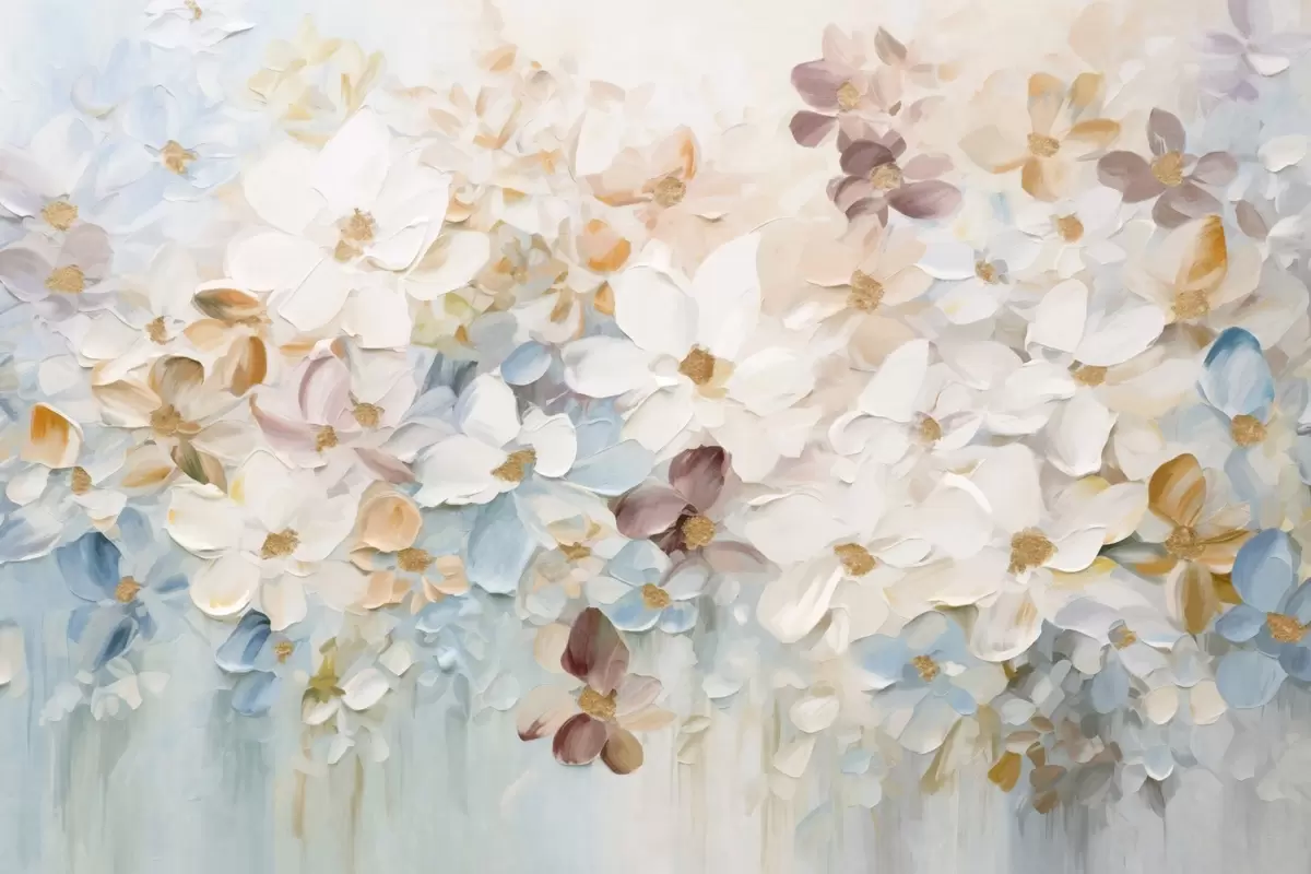 Fotomurales Pintura al óleo imitación de un jardín de flores con flores blancas, azules y naranjas, pinceladas suaves, colores pastel apagados Nr. w09236v1