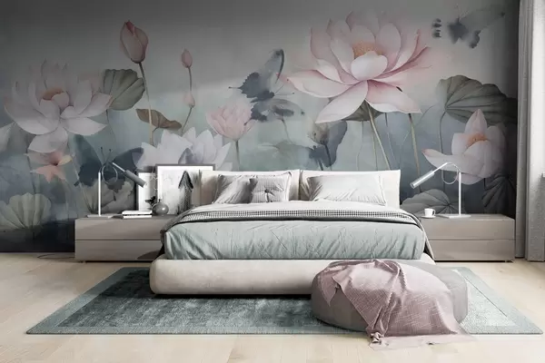 Fotomurales Flores de loto texturizadas con pétalos rosa pastel, hojas verdes, reflejo de agua, colores pastel suaves , efecto acuarela Nr. w09254