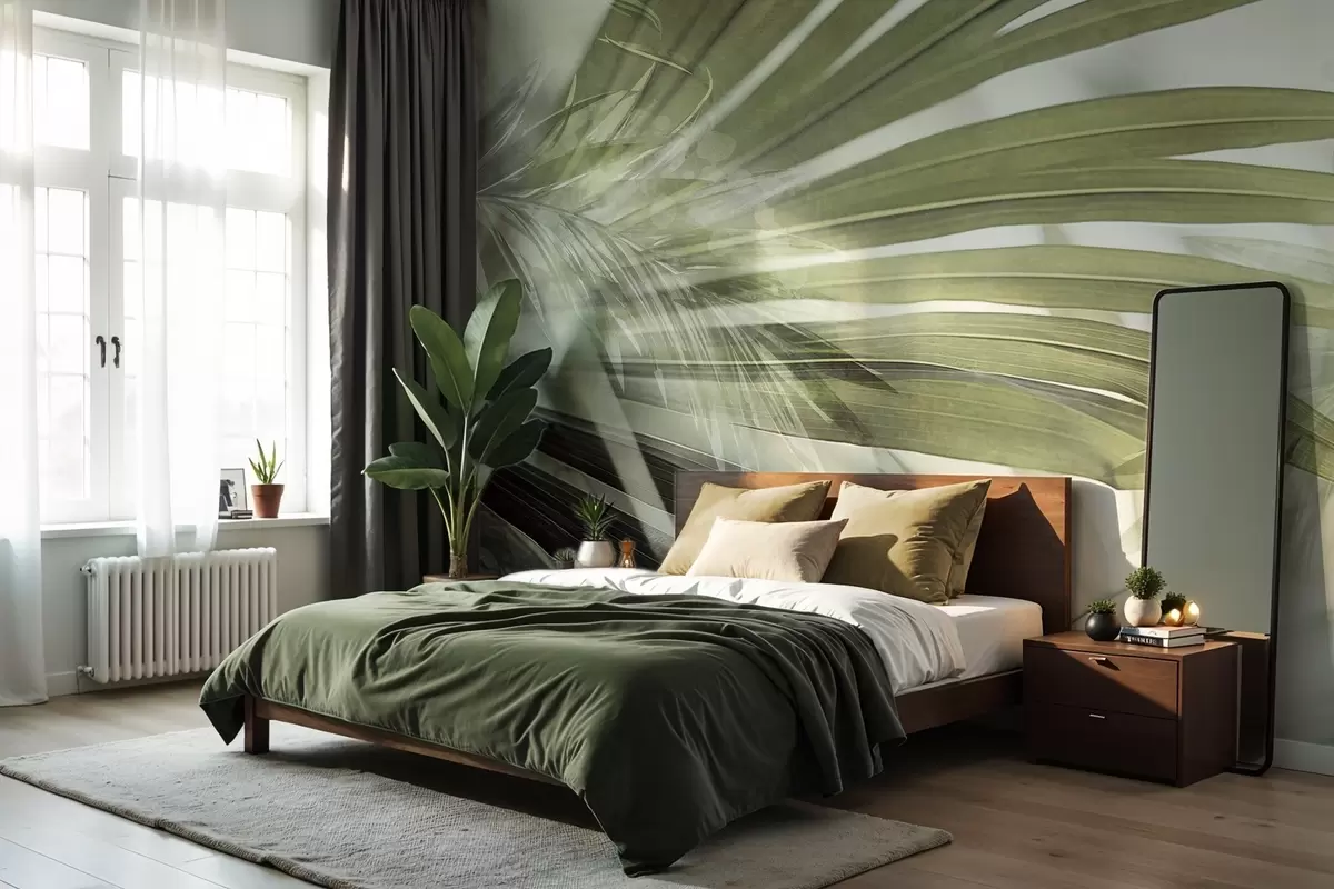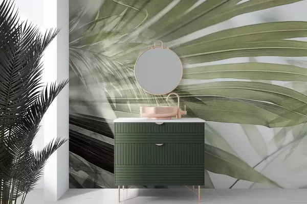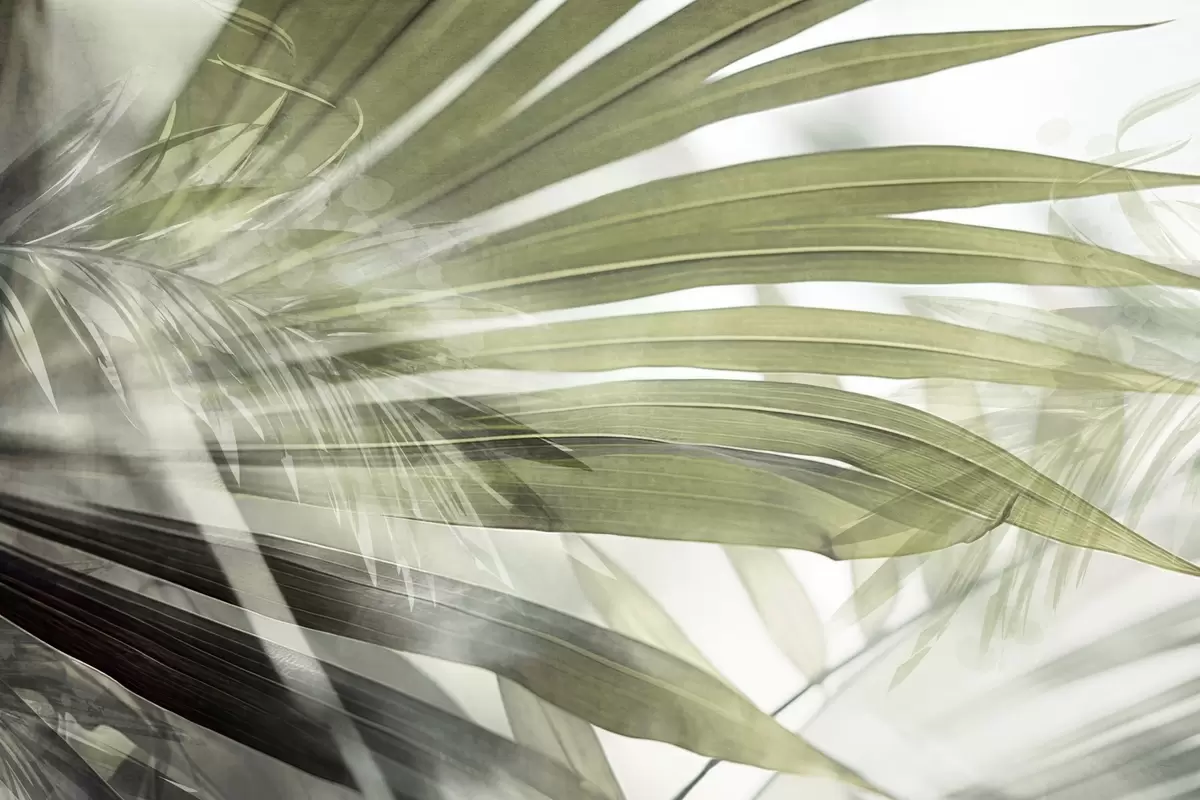 Fotomurales Hojas de palmera de un tono verde claro, superpuestas y creando un efecto de capas, sobre un fondo suave y neutro Nr. w09256v1
