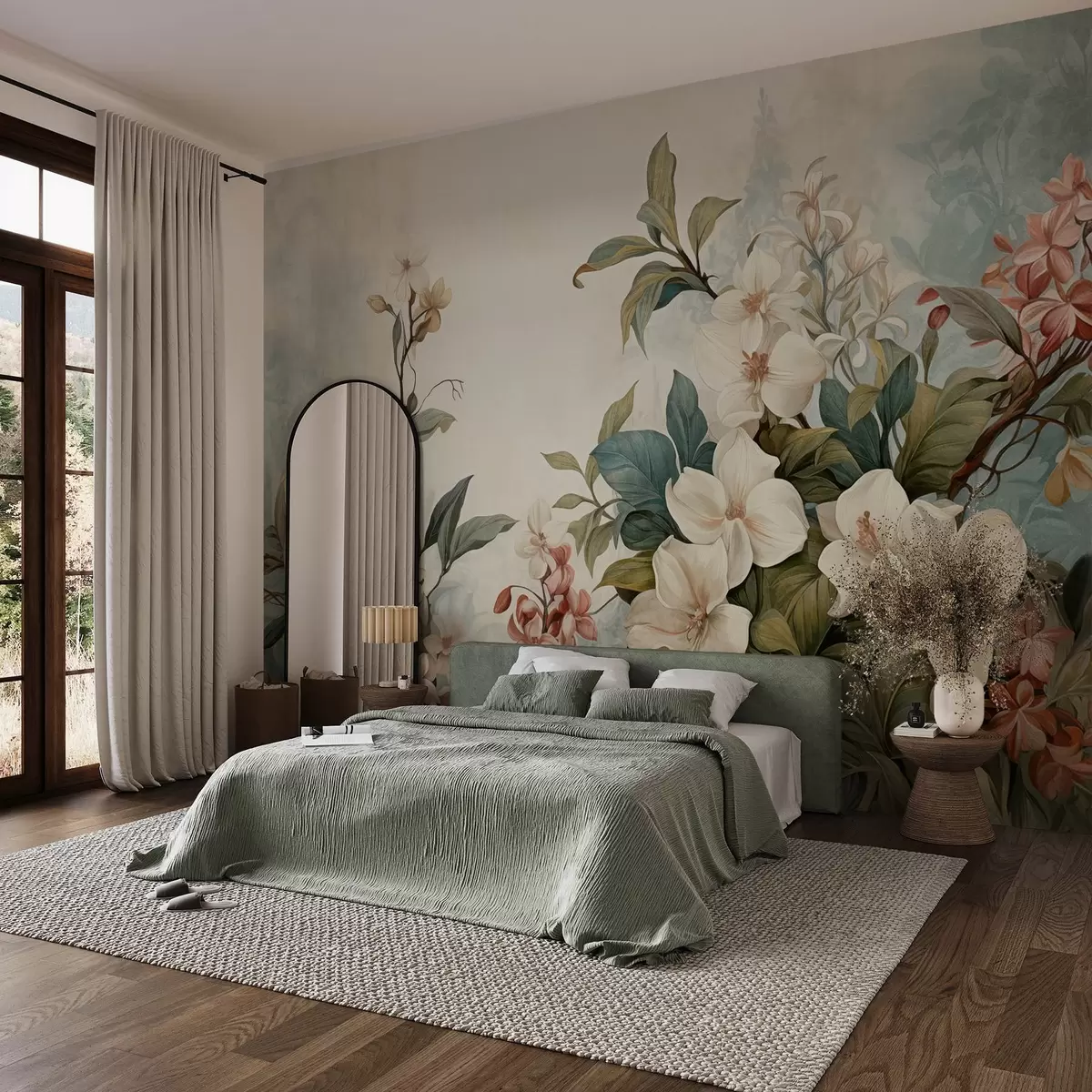Fotomurales Flores y hojas tropicales texturizadas con suaves tonos azules y verdes, delicadas pinceladas, estilo botánico vintage Nr. w09259