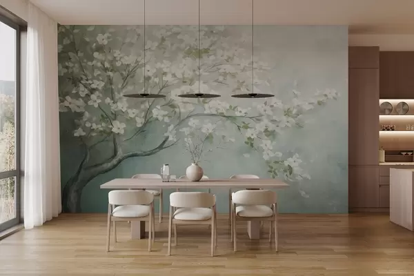 Fotomurales Un árbol en flor con flores blancas en plena floración, sobre un fondo granulado de textura ruidosa de azules y verdes apagados Nr. w09261