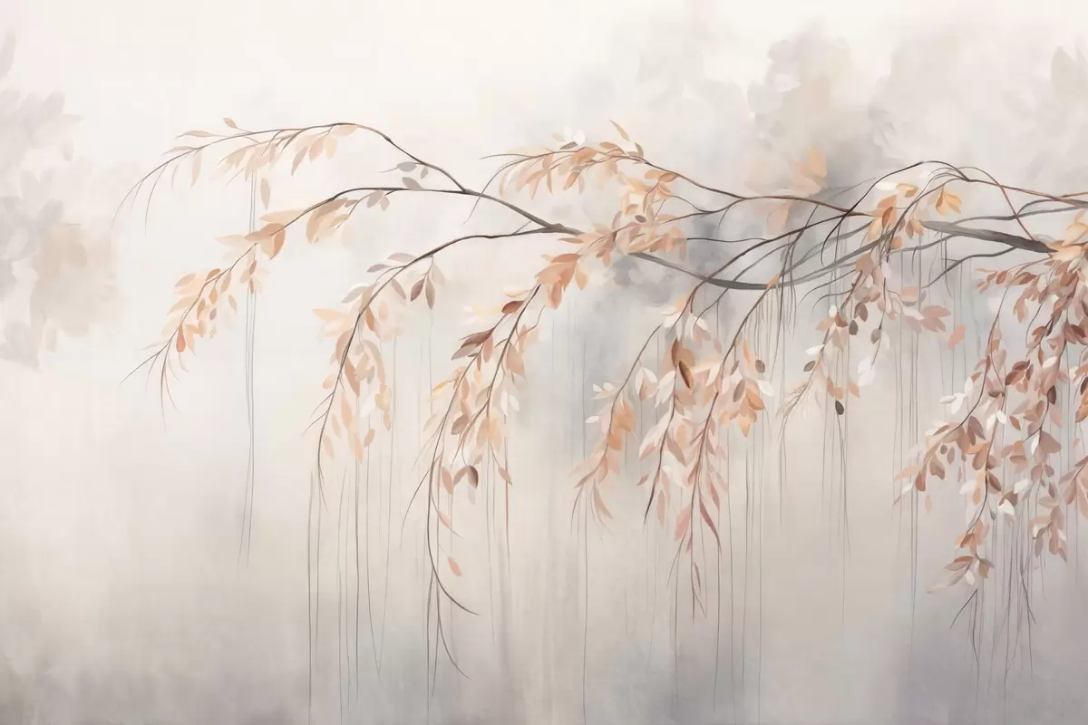 Fotomurales Una rama con hojas de color naranja claro colgando, fondo gris claro con textura borrosa, estilo suave y delicado Nr. w09265