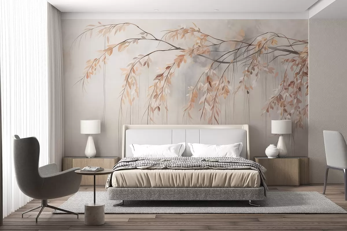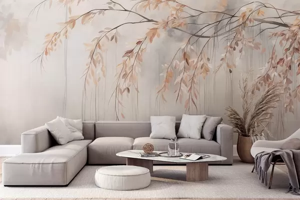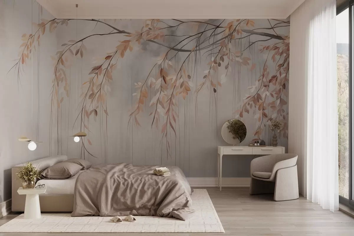 murales de pared Una rama con hojas de color naranja claro colgando, fondo gris claro con textura borrosa, estilo suave y delicado w09265