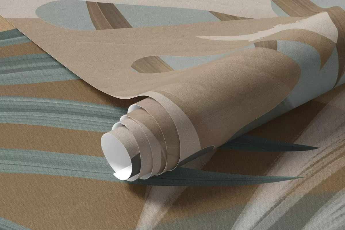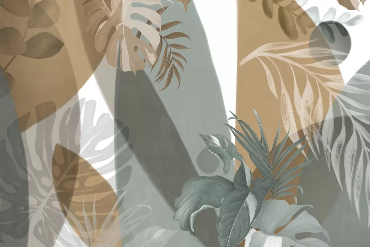 Fotomurales Hojas de Monstera y hojas de palma en un patrón con colores marrón, blanco y verde, ambiente tropical, formas abstractas, decorativo Nr. w09288