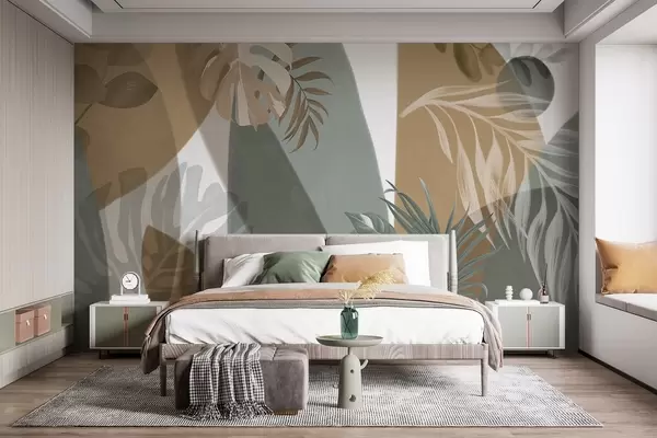 Fotomurales Hojas de Monstera y hojas de palma en un patrón con colores marrón, blanco y verde, ambiente tropical, formas abstractas, decorativo Nr. w09288