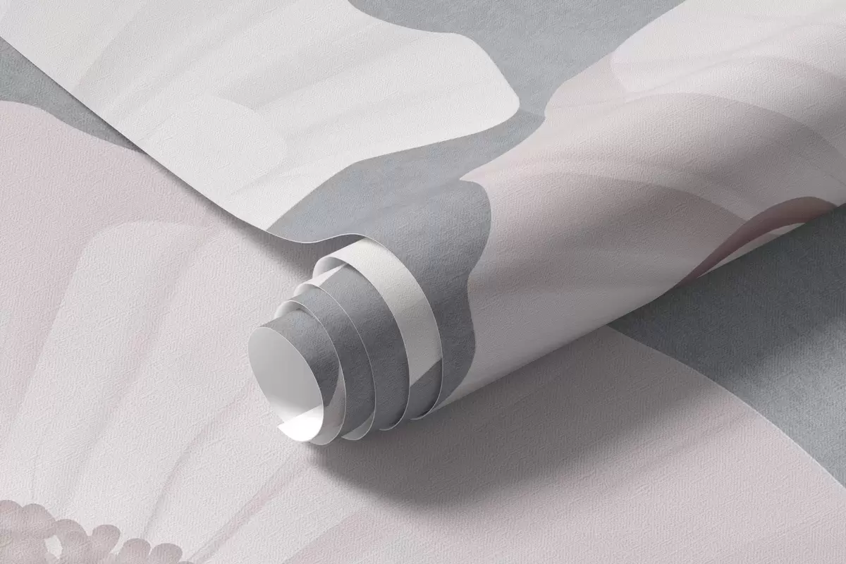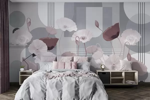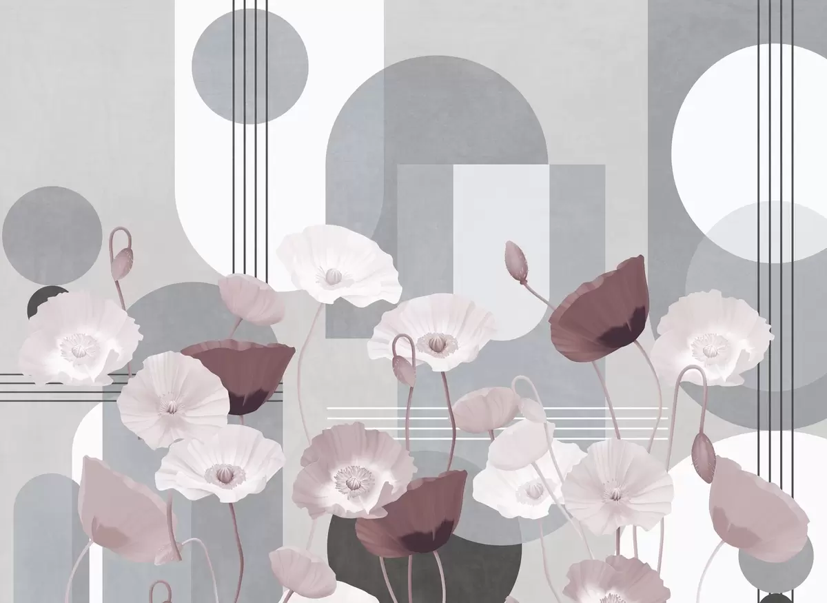 Fotomurales Amapolas en colores blanco y gris con formas geométricas en el fondo, círculos y arcos, estilo minimalista, colores suaves Nr. w09289v1