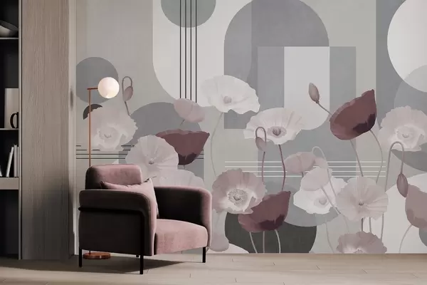 Fotomurales Amapolas en colores blanco y gris con formas geométricas en el fondo, círculos y arcos, estilo minimalista, colores suaves Nr. w09289v1