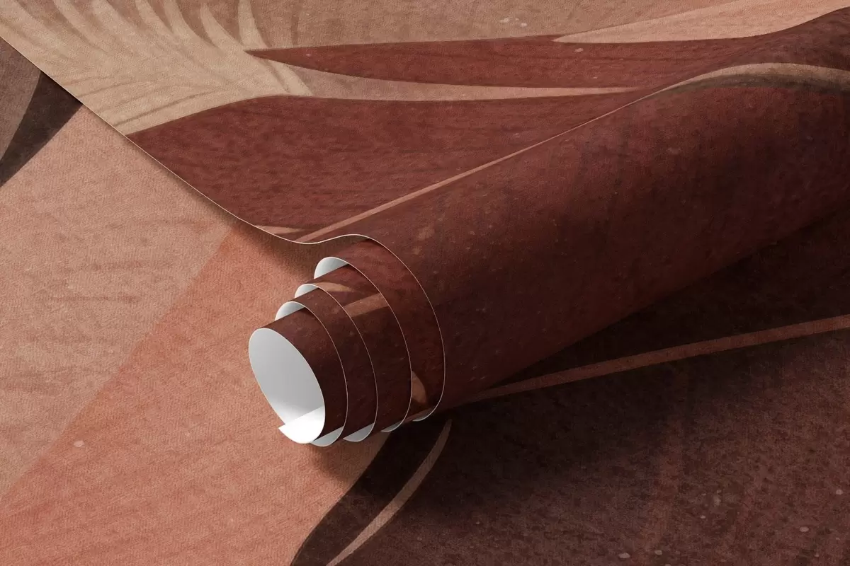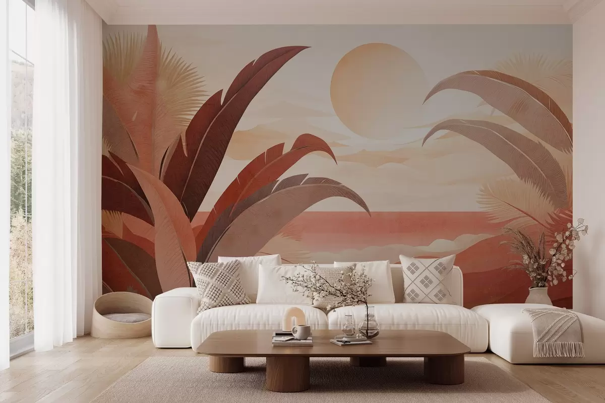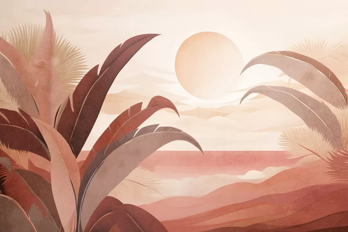 Fotomurales Paisaje abstracto de textura tropical con hojas de palmera y un gran sol en el cielo, paleta de colores cálidos, estilo minimalista, estilizado Nr. w09296