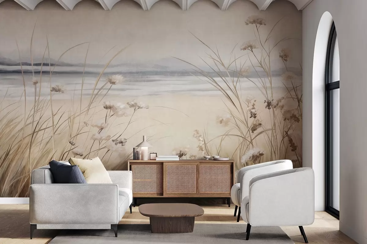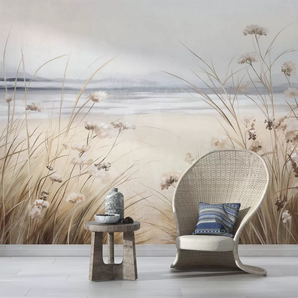 Fotomurales Un campo de trigo con flores blancas en primer plano, una playa y el océano al fondo, colores pastel neutros apagados Nr. w09298