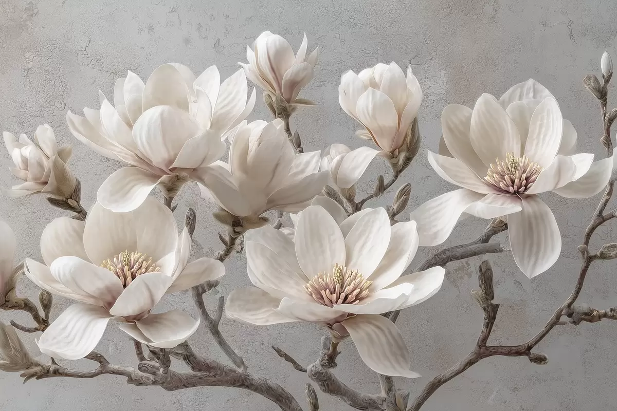 Fotomurales Ramas de magnolia con grandes flores claras en tonos apagados Nr. w09305