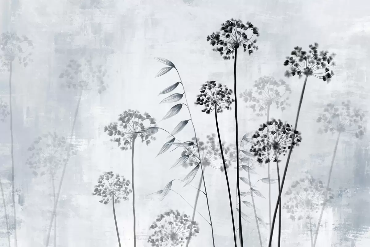 Fotomurales Dibujo de flores secas con tallos largos, paleta monocroma, sobre fondo gris claro texturado, ilustración botánica Nr. w09314