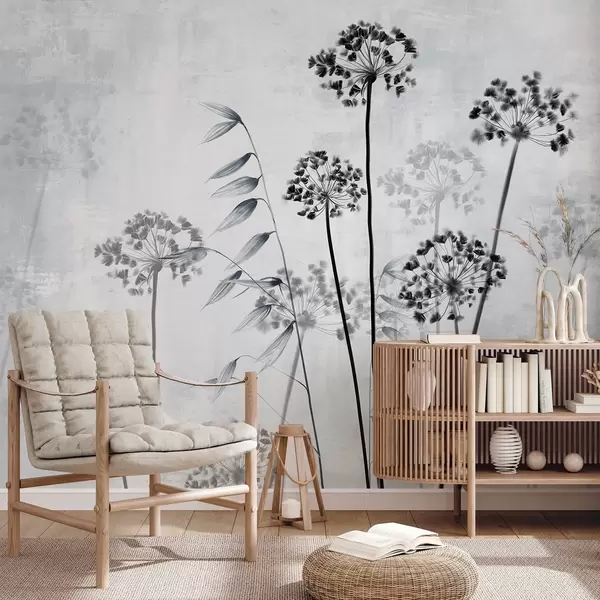 Fotomurales Dibujo de flores secas con tallos largos, paleta monocroma, sobre fondo gris claro texturado, ilustración botánica Nr. w09314