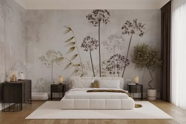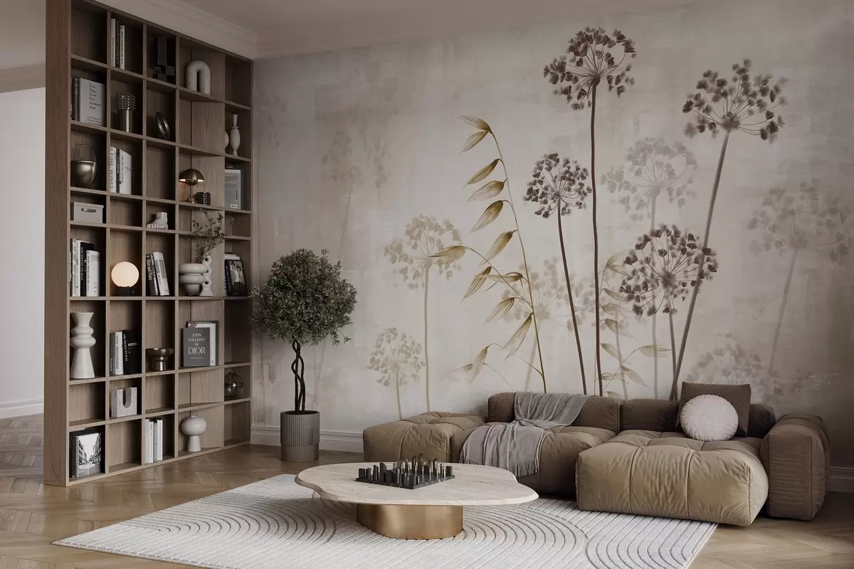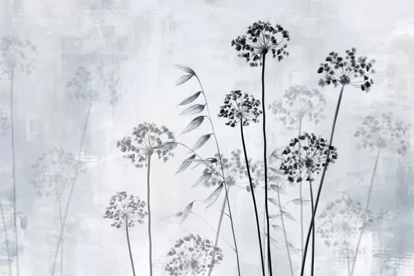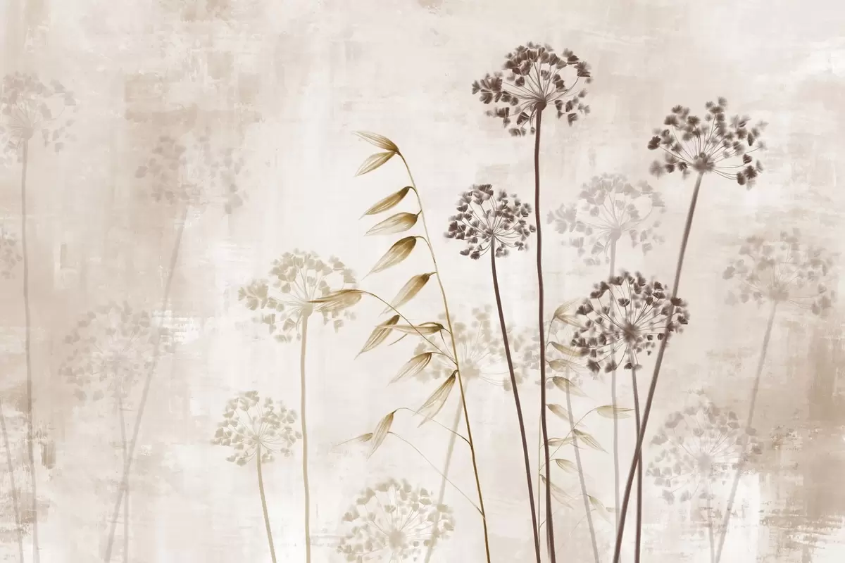 Fotomurales Dibujo de flores secas con tallos largos, paleta monocroma, sobre fondo beige claro texturado, ilustración botánica Nr. w09314v1