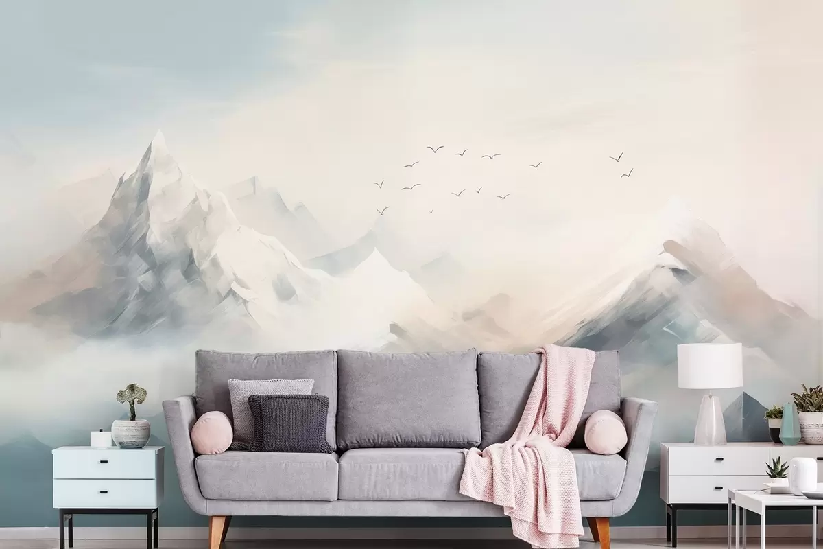 Fotomurales Montañas nevadas con niebla matinal y pájaros volando Nr. w09326