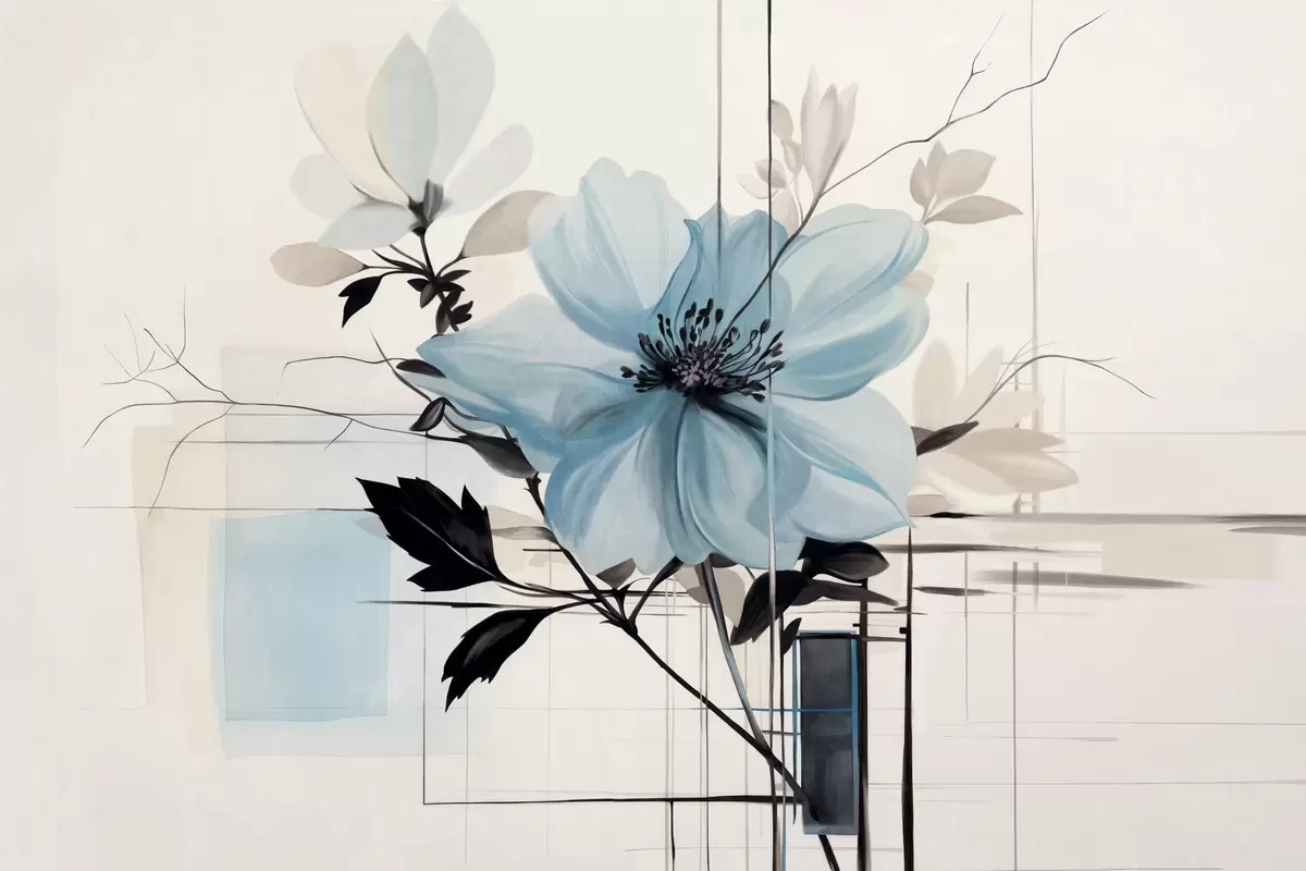 Fotomurales Flor abstracta azul texturizada con hojas y ramas oscuras, formas geométricas minimalistas y líneas en colores apagados Nr. w09332