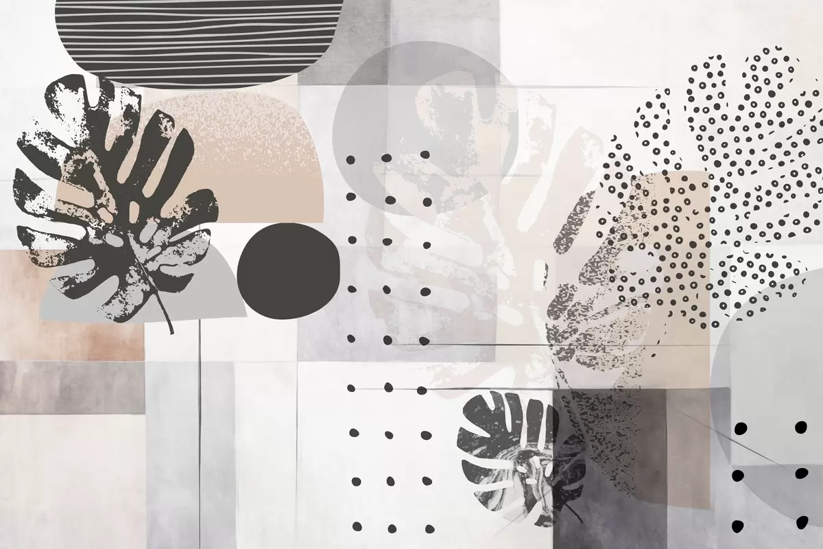 Fotomurales Estampado abstracto con formas geométricas y hojas tropicales de monstera, círculos, puntos y líneas, diseño moderno y minimalista Nr. w09333