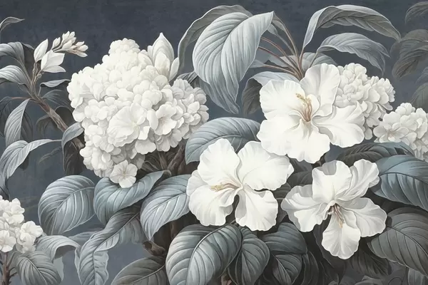 Fotomurales Flores tropicales blancas con delicados pétalos y hojas en un fondo azul oscuro, estilo vintage texturizado, ilustración botánica Nr. w09334