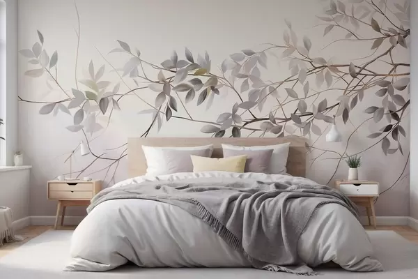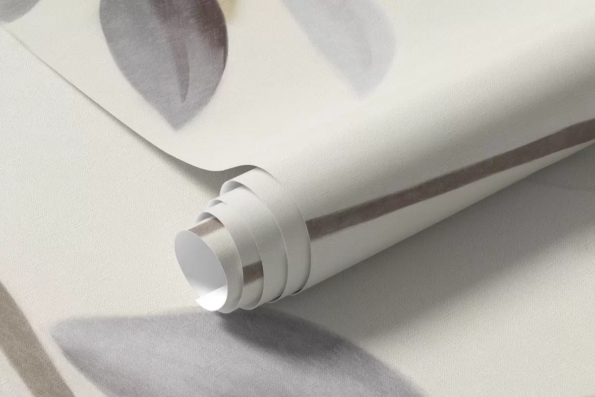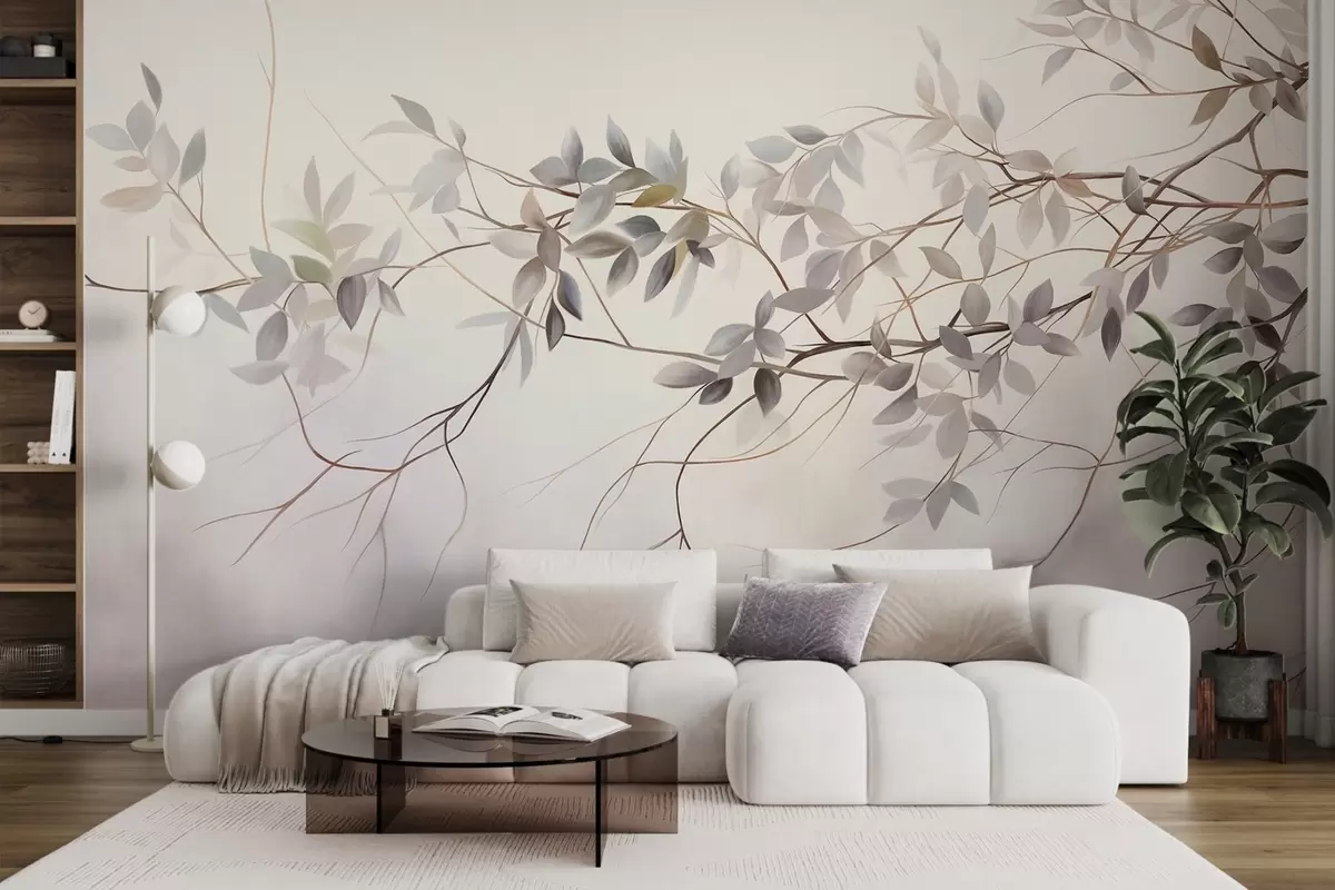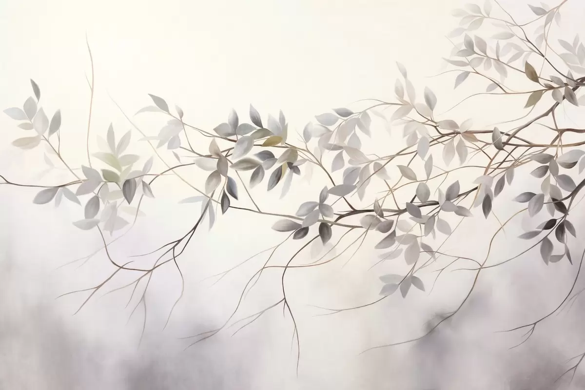 Fotomurales Ramas de textura delicada con hojas en tonos grises, morados y verdes apagados sobre un fondo suave y difuminado. Nr. w09336