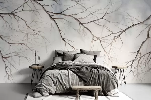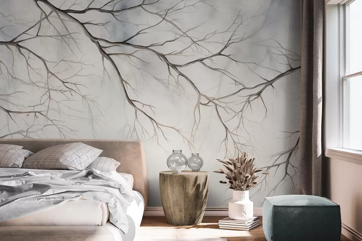 murales de pared Ramas de árbol con un efecto de textura de acuarela, detalles intrincados, paleta de colores suaves, sobre un fondo claro w09337