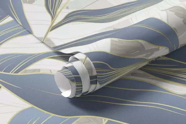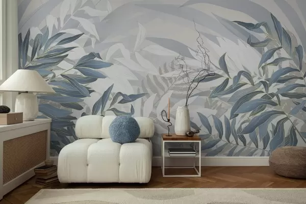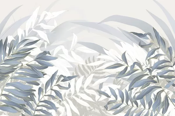Fotomurales Hojas y hierba azules y blancas, colores pastel suaves, ilustración botánica, diseño minimalista, decorativo, moderno Nr. w09341