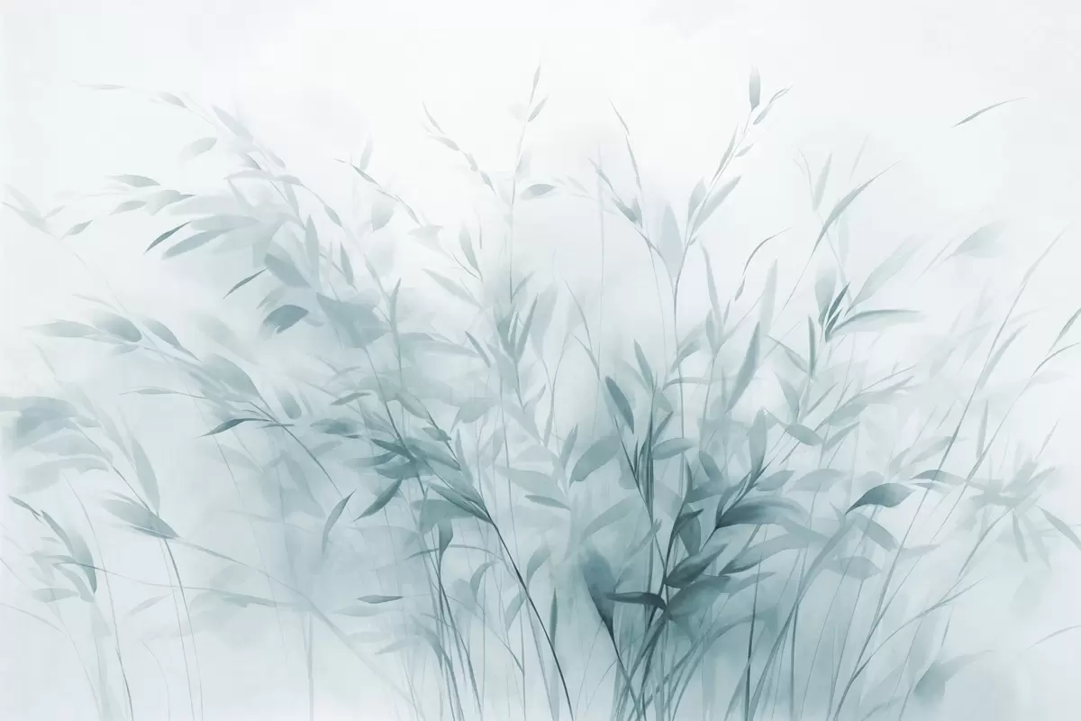 Fotomurales Hierba y maleza con hojas y tallos finos, colores azul claro, pinceladas suaves y delicadas, estampado minimalista Nr. w09342v1