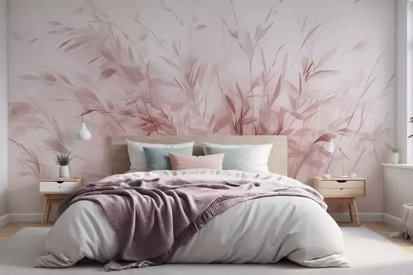 Fotomurales Hierba y maleza con hojas y tallos finos, colores rosa claro, pinceladas suaves y delicadas, estampado minimalista Nr. w09342v2