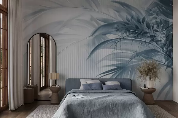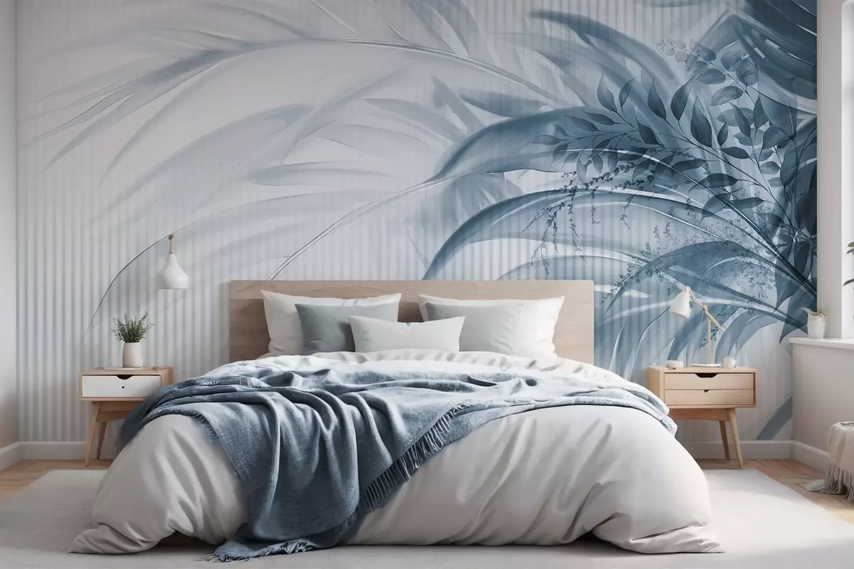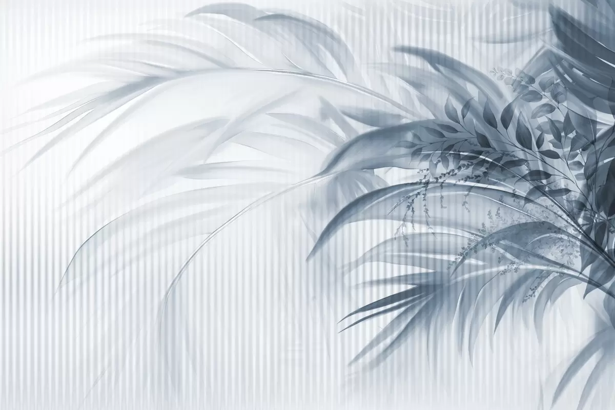 Fotomurales Palmera tropical de hojas azules con fondo blanco a rayas, iluminación suave, pinceladas delicadas, formas orgánicas Nr. w09343v1