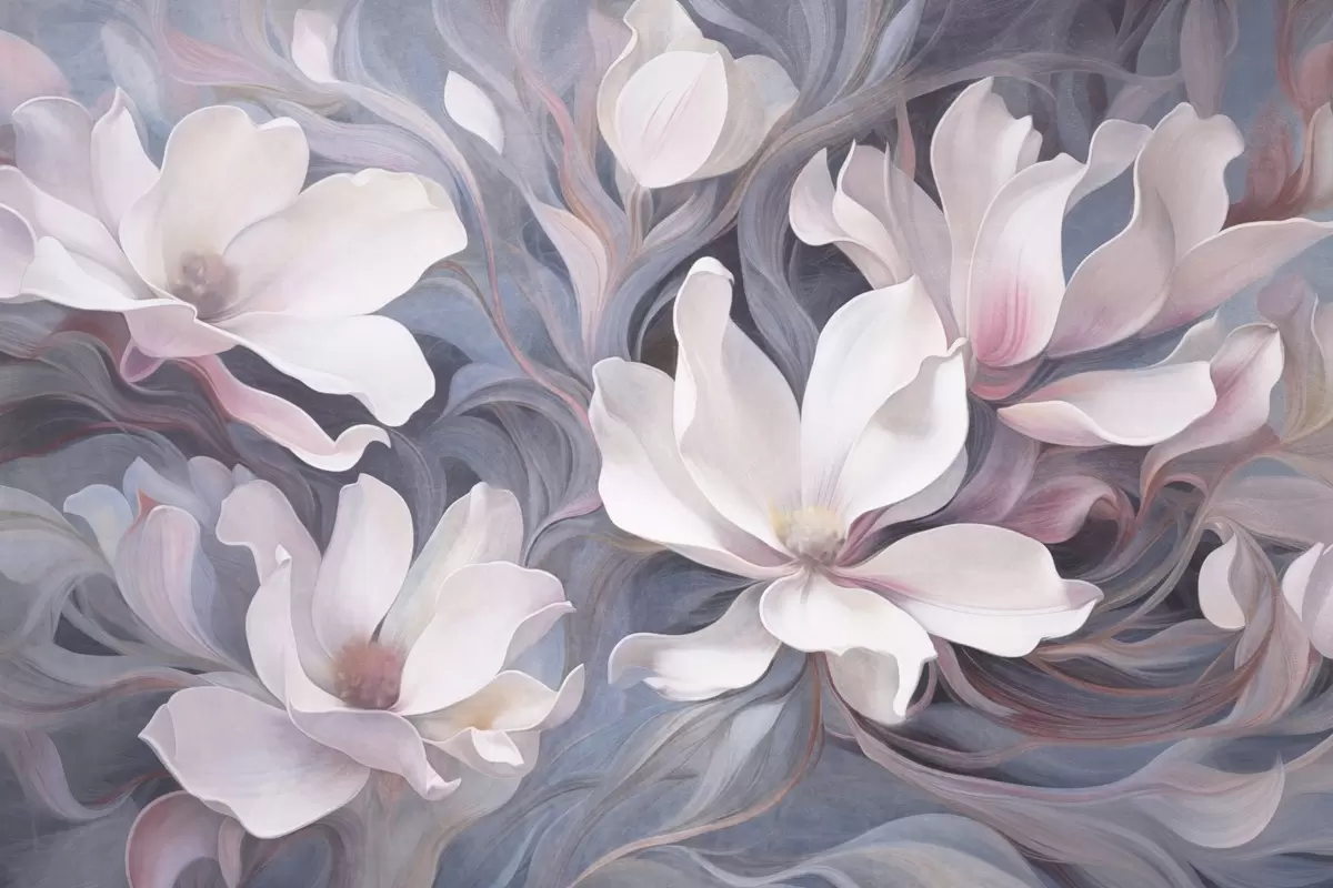 Fotomurales Pintura texturizada de flores blancas de magnolia con toques rosas, sobre un fondo de tonos azules y grises apagados Nr. w09344
